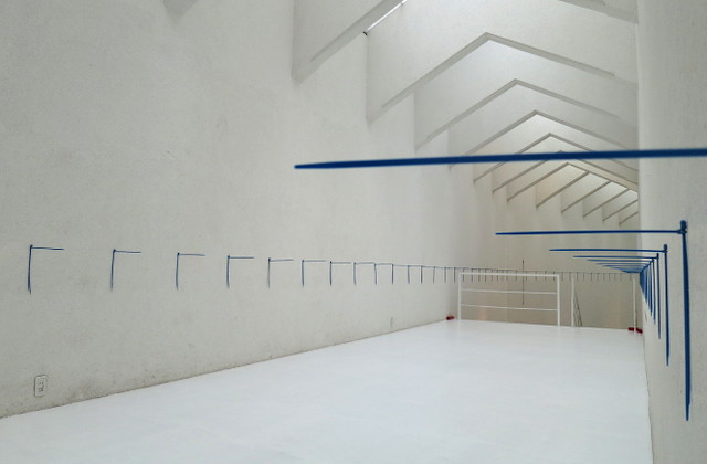屋内展示場の両側の壁に規則正しく並んだ作品が、天井に連続して見える山形の梁の呼びかけに応えているように見える。