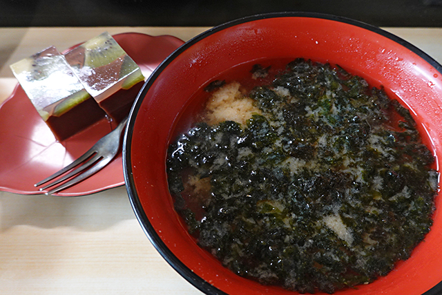 安房勝山の「寿司惣四郎」、暖簾が出るのを待つ客が四人。今日もランチは寿司になるが苦にならない。